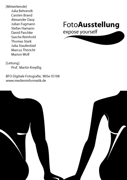 | Digitale Fotografie war der neutrale Titel der Berufsfeldorientierung. Dahinter verbarg sich der erste Versuch, sich dem Thema Aktfotografie als Studieninhalt zu widmen. In mehreren Sitzungen wurden mit unterschiedlichen Modellen Posen ausgearbeitet. Dabei stand die Gruppenarbeit der Studenten im Vordergrund: Kameraregie, Licht sowie Assistenz wechselten, so dass jeder Student seine eigenen Ideen umsetzen konnte. Das Ergebnis wurde in der Ausstellung 'Expose yourself' präsentiert. |
